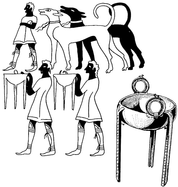 | Μυκηναίοι σε σπονδή με τρίποδα από την Πύλο Ανάκτορο Δωμάτιο 46 -Δεξιά τρίποδας από την μυκηναϊκή Ιθάκη .Ο Όμηρος αναφέρει ότι ο Οδυσσέας άφησε αφιερωματικό τρίποδα στην Πύλο |