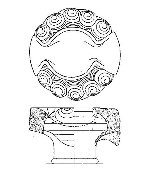 ![]() Επάνω Εγκλιανός, Ανάκτορο Νέστορος. Λύχνος από λευκό μάρμαρο (ύψους 14,5 εκ.) από τον Διάδρομο 61 (όψη από επάνω και τομές, κατά Blegen και Rawson 1966). Μουσείο Χώρας |